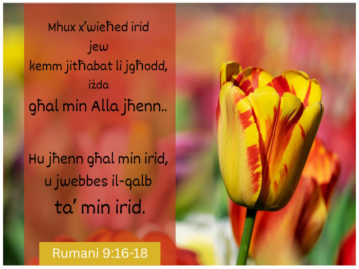 F’Rumani 9:16 naqraw “𝑀ℎ𝑢𝑥 𝑥’𝑤𝑖𝑒ħ𝑒𝑑 𝑖𝑟𝑖𝑑 𝑗𝑒𝑤 𝑘𝑒𝑚𝑚 𝑗𝑖𝑡ħ𝑎𝑏𝑎𝑡 𝑙𝑖 𝑗𝑔ħ𝑜𝑑𝑑, 𝑖𝑧̇𝑑𝑎 𝑔ħ𝑎𝑙 𝑚𝑖𝑛 𝐴𝑙𝑙𝑎 𝑗ħ𝑒𝑛𝑛.”